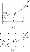 Ⅰ.使电子以初速度v1垂直通过宽为L的匀强电场区域,测出偏向角θ,已知匀强电场的场强大小为E,方向如图(a)所示