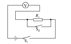 2、实验题 一直流电压表,内阻为RV,一直流电源(电动势未知,内阻可忽略不计),两个单刀开关S1、S2及若干导线.已知电压表的量程略大于电池组的电动势,现用这些器材测量一电阻值较大的定值电阻Rx的值.