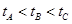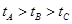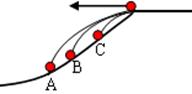 5、选择题  三名滑雪运动员从同一平台上的O点先后以速度VA、VB、VC沿水平方向跃出并分别落在A、B、C三点,如图所示,所用时间分别为tA、tB、tC,则以下关系正确的是: