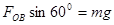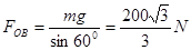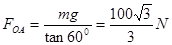 1、计算题 (6分)如图所示,重为100N的物体,由OA、OB两条细绳悬挂在两边的墙壁上处于静止状态。已知OA绳处于水平状态,OB绳与水平方向夹角为600,分别求出OA、OB绳上拉力FOA、FOB的大小。