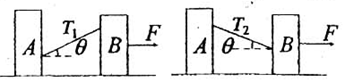 3、选择题 如图所示,A、B两木块质量分别是mA、mB,与水平地面的摩擦因数分别为μ1、μ2,两木块放在水平面上,它们之间用细线相连,两次连接情况中细线倾斜方向不同但倾角一样。先后用相同的水平力F拉着A、B一起匀速运动,则μ1、μ2之比是( )