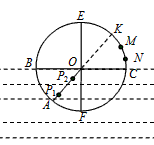 4、实验题 某研究小组的同学根据所学的光学知识,设计了一个测量液体折射率的仪器。如图所示,在一个圆盘上,过其圆心O做两条互相垂直的直径BC、EF。在半径OA上,垂直盘面插上两枚大头针P1、P2并保持P1、P2位置不变,每次测量时让圆盘的下半部分竖直进入液体中,而且总使夜面与直径BC相平,EF作为界面的法线,而后在图中右上方区域观察P1、P2的像,并在圆周上插上大头针P3,使P3正好挡住P1、P2的像。同学们通过计算,预先在圆周EC部分刻好了折射率的值,这样只要根据P3所插的位置,就可以直接读出液体折射率的值。