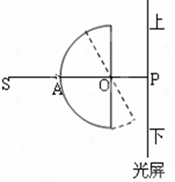 1、选择题 如图所示, S是红光与蓝光的固定的复色光源,发出一条细光束沿横截面为半圆形透明圆柱体圆心O的方向射入,经圆柱后打在光屏上的P点。现把玻璃砖绕过O点垂直纸面轴逆时针转300角,则可能