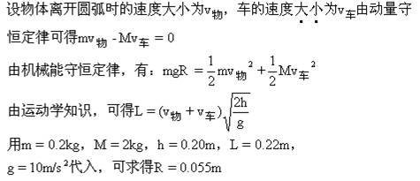 4、简答题  如图,静止于水平地面的小车,一端高h 的支架上固定着一个半径为R的1/4圆弧光滑导轨,一质量m=0.2kg的物体从圆弧的顶端由静止无摩擦地滑下,离开圆弧后刚好从车的另一端擦过落到地面.车的质量M=2kg,车身长L=0.22m,车与地面间的摩擦不计,支架高h=0.20m,重力加速度g=10m/ ,求R=?