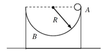 3、选择题 如图所示,物体A、B的质量分别为m、2m,物体B置于水平面上,B物体上部半圆型槽的半径为R,将物体A从圆槽的右侧最顶端由静止释放,一切摩擦均不计。则
