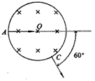 5、计算题 如图所示,半径为r的圆形区域内存在着垂直纸面向里的匀强磁场,磁感应强度为B。现有一带电离子(不计重力)从A以速度v沿圆形区域的直径射入磁场,已知离子从C点射出磁场的方向间的夹角为60°。