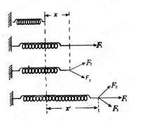 2、选择题 如图所示,一轻质弹簧只受一个拉力F1?时,其伸长量为x,当弹簧同时受到两个拉力F2和F3作用时,伸长量也为x,现对弹簧同时施加F1 、F2、F3 三个力作用时,其伸长量为x′,则以下关于x′与x关系正确的是