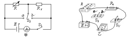 =0.5Ω),电阻箱R(量程99.99Ω),待测电阻Rx,直流电源(电动势E和内阻r待测),单刀单掷开关S1,单刀双掷开关S2,带铁夹的导线若干。某探究实验小组设计如图甲所示的实验电路,用来测定待测电阻的阻值Rx、直流电源的电动势E和内阻r。