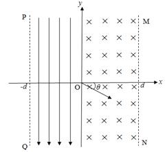 1、计算题 (12分)如图所示,在竖直平面建立直角坐标系xOy,y轴左侧存在一个竖直向下的宽度为d的匀强电场,右侧存在一个宽度也为d的垂直纸面向里的匀强磁场,磁感应强度为B,现有一个质量为m,带电荷量为+q的微粒(不计重力),从电场左边界PQ以某一速度垂直进入电场,经电场偏转后恰好从坐标原点以与x轴正方向成θ=30°夹角进入磁场: