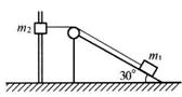 2、计算题 (10分)如图所示,一轻绳通过无摩擦的定滑轮与放在倾角为30°的光滑斜上的物体m1连接,另一端和套在光滑竖直杆上的物体m2连接,图中定滑轮到竖直杆的距离为