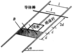 3、计算题 如图所示,两平行的光滑金属导轨安装在一光滑绝缘斜面上,导轨间距为l、足够长且电阻忽略不计,导轨平面的倾角为α,条形匀强磁场的宽度为d,磁感应强度大小为B、方向与导轨平面垂直。长度为2d的绝缘杆将导体棒和正方形的单匝线框连接在一起组成“