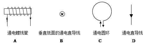 3、选择题 如图,在方框中有一能产生磁场的装置,现在在方框右边放一通电直导线(电流方向如图箭头方向),发现通电导线受到向右的作用力,则方框中放置的装置可能是下面哪个