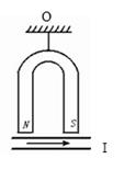 1、选择题 如图所示,蹄形磁体用悬线悬于O点,在磁铁的正下方有一水平放置的长直导线,当导线中通以由左向右的电流时,蹄形磁铁的运动情况将是(?)