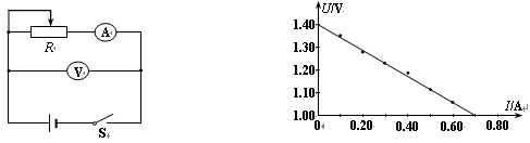 4、实验题  如图所示,用该实验研究闭合电路的欧姆定律,开关闭合前滑动变阻器R的滑片滑到       (填“左侧”或“右侧”),根据实验测得的几组I、U数据作出U—I图象如图所示,由图象可确定:该电源的电动势为       V,电源的内电阻为       Ω(结果保留到小数点后两位)。