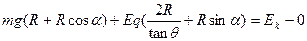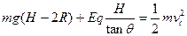 ![]() 参考答案:因为洛伦兹力对粒子永远不做功,则根据动能定理,磁场存在与否,重力和电场力对小球做功相同,则小球着地时的速率都应该是相等的,即v1=v2.存在磁场时,小球就要受到向右上方的洛伦兹力,有竖直向上的分力,使得小球在竖直方向的加速度小于没有磁场时的加速度,在空中飞行的时间要更长些.即t1>t2.故D正确. 本题解析: 本题难度:一般 4、计算题 如图所示,绝缘轨道平面与水平面垂直,倾斜轨道部分摩擦因数μ=0.2,倾斜轨道与水平面夹角θ=37°,倾斜轨道足够长与半径R=0.5m的半圆形光滑轨道圆滑连接,整个轨道处在水平向左的匀强电场中,电场强度E=10V/m,一带负电的小物块质量为0.3kg所带电量为0.4C,让小物块在倾斜轨道上从与半圆轨道最高点C点等高的A点由静止释放。(重力加速度g=10m/s2,sin37°= 参考答案: 本题解析:(1)令小物块动能最大的位置为D点,分析得: 本题难度:一般 5、填空题 在足球赛中,红队球员在白队禁区附近主罚定位球,并将球从球门右上角擦着横梁踢进球门。球门高度为h,足球飞入球门的速度为v,足球的质量m,则红队球员将足球踢出时的速度v0=________,该队员踢球时对足球做功W=________。(不计空气阻力)