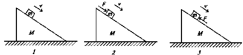 4、选择题 如图所示,粗糙的斜面体M放在粗糙的水平面上,物块m恰好能在斜面体上沿斜面匀速下滑,斜面体静止不动,斜面体受地面的摩擦力为F1;若用平行与斜面向下的力F推动物块,使物块加速下滑,斜面体仍静止不动,斜面体受地面的摩擦力为F2;若用平行于斜面向上的力F推动物块,使物块减速下滑,斜面体还静止不动,斜面体受地面的摩擦力为F3。则