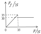 2、计算题 重量为100N的木箱放在水平地板上,至少要用35N的水平推力,才能使它从原地开始运动,木箱从原地移动后,用30N的水平推力,就可以使木箱继续做匀速运动。 由此可知木箱与地板间的最大静摩擦力为多少?木箱与地板间的动摩擦因数为多少?如果水平推力为F,木箱所受的摩擦力为Ff,请画出Ff随F变化的函数图象?