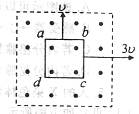 1、选择题  如图所示,正方形匀强磁场区域内,有一个正方形导线框abcd,导线粗细均匀,导线框平面与磁感线垂直,导线框各边分别与磁场边界平行。第一次将导线框垂直磁场边界以速度v匀速拉出磁场,第二次朝另一个方向垂直磁场边界以速度3v匀速拉出磁场,则将导线框两次拉出磁场的过程中