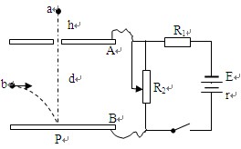 4、计算题 如图所示的电路中,电源电动势E=24V、内阻r=1Ω,定值电阻R1=15Ω。水平放置的平行金属板AB间距d=40cm,上板A开一小孔。合上电键,适当调整R2的有效阻值,然后让一个质量m=0.02kg、带电量q=-0.01C的小球a从距小孔正上方高h=10cm处自由下落,当a刚进入小孔时,另一小球b(质量、电量与小球a的完全相同)恰好从两板的正中央水平飞入,两球同时打在小孔正下方B板上的P点。小球视为质点,小球间的作用力及空气阻力均忽略不计,g=10m/s2.求: