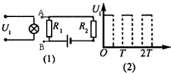 3、选择题 图(1)中R1为光敏电阻,R2为定值电阻。将图(2)中的方波电压加在小灯泡两端,灯泡随方波电压而明灭变化。灯光照到R1上,引起AB间的电压变化。下面四幅图象能够正确反映A、B两点间电压U2随时间变化的是