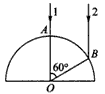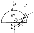 5、计算题 半径为R的玻璃半圆柱体,横截面如图所示,圆心为O。两条平行单色红光沿截面射向圆柱面,方向与底面垂直,光线1的入射点A为半圆柱的顶点,光线2的入射点为B,∠AOB=60°。已知该玻璃对红光的折射率n=。