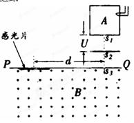 5、计算题 (10分)如图所示是测量带电粒子质量的仪器工作原理示意图。设法使某有机化合物的气态分子导入图中所示的容器A中,使它受到电子束轰击,失去一个电子变成正一价的分子离子。分子离子从狭缝s1以很小的速度进入电压为U的加速电场区(初速不计),加速后,再通过狭缝S2、S3、方向垂直于磁场区的界面PQ,方向垂直于磁场区的界面PQ,射入磁感强度为B的匀强磁场。最后,分子离子打到感光片上,形成垂直于纸面而且平行于狭缝s3的细线。若测得细线到狭缝s3的距离为d,试导出分子离子的质量m的表达式。