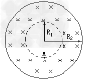 1、计算题 核聚变反应需几百万度高温,为把高温条件下高速运动的离子约束在小范围内,通常采用磁约束的方法(托卡马克装置)。如图是磁约束装置的截面示意图,环状匀强磁场围成一个中空区域,中空区域中的带电粒子只要速度不是很大,都不会穿出磁场的外边界。设环状磁场的内半径R1=0.6m、外半径R2=1.2m,磁场的磁感应强度B=0.4T,磁场方向如图。?已知被约束的氦核的荷质比q/m=4.8×107C/kg,中空区域内的氦核具有各个方向的速度。不计带电粒子的重力。试计算