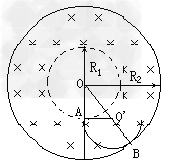 (2)当氦核沿内圆的的切线方向射入磁场时,轨道半径最大为r"=(R2-R1)/2=0.3m
