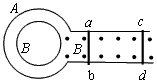 1、选择题 如图所示,在匀强磁场中水平放一电阻不计的平行金属导轨,导轨上放二根导线ab和cd,导轨跟大线圈A相接,A内有一闭合小线圈B。磁感线垂直导轨所在的平面向上(俯视图),现要使得cd与ab间距离减小,下列操作可行的是