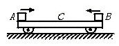 5、简答题 如图所示,平板小车C静止在光滑的水平面上.现在A、B两个小物体(可视为质点),分别从小车C的两端同时水平地滑上小车.初速度vA="0.6" m/s,vB="0.3" m/s.A、B与C间的动摩擦因数都是μ=0.1.A、B、C的质量都相同.最后A、B恰好相遇而未碰撞.且A、B、C以共同的速度运动.g取10 m/s2.求: