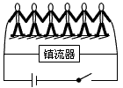 3、填空题 如图所示,一个称为“千人震”的趣味物理小实验所用器材是一节电动势为1.5V的新干电池、几根导线、开关和一个用于日光灯上的镇流器,几位同学手拉手连成一排,另一位同学将电池、镇流器、开关用导线连接起来,并将它们和首、尾两位同学两只空着的手相连,在开关_______(填“闭合”或“断开”)时就会使连成一排的同学都有触电的感觉,该实验的原理是_______。