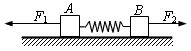4、选择题 质量分别为2kg和3kg的物块A、B放在光滑水平面上并用轻质弹簧相连,如图所示,今对物块A、B分别施以方向相反的水平力F1、F2,且F1=20 N、F2=10 N,则下列说法正确的是