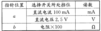 4、实验题 用多用电表进行了几次测量,指针分别处于a、b的位置,如图所示。若多用电表的选择开关处于下面表格中所指的档位,a和b的相应读数是多少?请填在表格中。