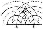 4、选择题 如图所示是单色光双缝干涉实验某一时刻的波形图,实线表示波峰,虚线表示波谷。在此时刻,介质中A点为波峰相叠加点,B点为波谷相叠加点,A、B连线上的C点为某中间状态相叠加点。如果把屏分别放在A、B、C三个位置,那么