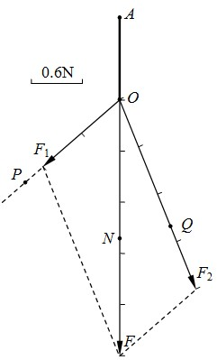 4、简答题 某实验小组做“探究求合力的方法”实验,如图,将橡皮条的一端固定在A点,先用两个弹簧秤互成角度地拉细绳,使细绳和橡皮条的结点到达O点,两个弹簧秤的度数分别为F1=1.20N、F2=2.40N,记下此时F1和F2这两个力所拉细绳上的一点分别为P和Q,然后只用一个弹簧秤拉橡皮条,使结点重新到达O点,弹簧秤的读数为F=3.00N,记下此时力F所拉牺牲上的一点为N.请你接着完成下列实验过程: