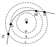 5、选择题 如图所示,虚线a、b和c是在O点处的一个点电荷形成的静电场中的三个等势面,一带正电粒子射入该电场中,其运动轨迹如实线KLMN所示.不计重力, 由图可知( ? )