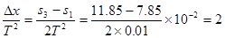 2、填空题 实验“测定匀变速直线运动的加速度”中,打点计时器接50 Hz的交流电源, 振针每隔 s 打一个点,得到的纸带如图5所示,B、C之间的时间为 s,,用刻度尺测得S1=7.85cm、S2=9.85cm、S3="11.85cm," 则这个做匀变速直线运动的物体的加速度为 m/s2, 物体运动到C时的瞬时速度约为 m/s(保留三位有效数字)。