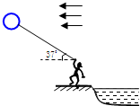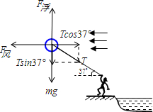 5、简答题 如图,节日期间小强站在水平河岸旁边欣赏风景,他手中牵住一重为10N的轻气球,由于受水平风力的影响,系气球的轻绳与水平成370角.已知空气对气球的浮力为16N,小强重500N,小强受的浮力不计.(g=10m/s) 求:(1)水平风力和绳子拉力的大小(sin37°=0.6cos37°=0.8) (2)小强对地面的压力大小 (3)若水平风力增强,小强对地面的压力是否变化?请说明理由.