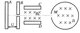 ![]() 2、计算题 (18分)如图,带电量为+q、质量为m的粒子(不计重力)由静止开始经A、B间电场加速后,沿中心线匀速射入带电金属板C、D间,后粒子由小孔M沿径向射入一半径为R的绝缘筒,已知C、D间电压为U0,板间距离为d,C、D间与绝缘筒内均有垂直于纸面向里的匀强磁场,磁感应强度分别为B0、B. 3、选择题 如图所示,MN是纸面内的一条直线,其所在空间充满与纸面平行的匀强电场或与纸面垂直的匀强磁场(场区都足够大),现有一个重力不计的带电粒子从MN上的O点以水平初速度v0射入场区,下列判断正确的是 [? ] A.如果粒子回到MN上时速度增大,则该空间存在的场一定是电场 B.如果粒子回到MN上时速度大小不变,则该空间存在的场可能是电场 C.若只改变粒子的初速度大小,发现粒子再回到MN上时与其所成的锐角夹角不变,则该空间存在的场一定是磁场 D.若只改变粒子的初速度大小,发现粒子再回到MN上所用的时间不变,则该空间存在的场一定是磁场 4、计算题 如图为汤姆生在1897年测量阴极射线(电子)的比荷时所用实验装置的示意图。K为阴极,A1和A2为连接在一起的中心空透的阳极,电子从阴极发出后被电场加速,只有运动方向与A1和A2的狭缝方向相同的电子才能通过,电子被加速后沿OO"方向垂直进入方向互相垂直的电场、磁场的叠加区域。磁场方向垂直纸面向里,电场极板水平放置,电子在电场力和磁场力的共同作用下发生偏转。已知圆形磁场的半径为r,圆心为C。 5、计算题 如图所示,在半径为R的绝缘圆筒内有匀强磁场,方向垂直于纸面向里,圆筒正下方有小孔C与平行金属板M、N相通。两板间距离为d,两板与电动势为E的电源连接。一电荷量为-q、质量为m的带电粒子(重力忽略不计),开始时静止于C点正下方紧靠N板的A点,经电场加速后从C点进入磁场,并以最短的时间从C 点射出。已知带电粒子与筒壁的碰撞无电荷量的损失,且碰撞后以原速率返回,求: |