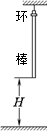 2、计算题 (15分)如图所示,一轻绳吊着粗细均匀的棒,棒下端离地面高H,上端套着一个细环,棒和环的质量均为m,相互间最大静摩擦力等于滑动摩擦力kmg(k>1),断开轻绳,棒和环自由下落,假设棒足够长,与地面发生碰撞时,触地时间极短,无动能损失,棒在整个运动过程中始终保持竖直,空气阻力不计,求: