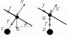 4、选择题 如图所示,两个倾角相同的滑杆上分别套有A、B两个圆环,两个圆环上分别用细线悬吊着两个物体C、D,当它们都沿滑杆向下滑动时,A的悬线与杆垂直,B的悬线竖直向下.则下列说法中正确的是(?)