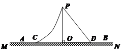4、选择题 如图所示,曲面PC和斜面PD固定在水平面MN上,C、D处平滑连接,O点位于斜面顶点P的正下方。某人从顶端P由静止开始分别沿曲面和斜面滑下,经过C、D两点后继续运动,最后停在水平面的A、B两处。各处材质相同,忽略空气阻力,则
