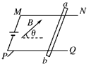 ![]() 参考答案:当风扇转过一定角度向右侧方吹时,挡板无法挡住小风扇吹出的风的面积,气流将使小车向左运动.随着风扇顺时针旋转,气流在不断改变方向,直至完全吹向左侧.则小车也逐步改为向右运动; 本题解析: 本题难度:简单 4、计算题 水平面上有电阻不计的U形导轨NMPQ,它们之间的宽度为L,M和P之间接入电动势为E的电源(不计内阻)。现垂直于导轨搁一根质量为m,电阻为R的金属棒ab,并加一个范围较大的匀强磁场,磁感应强度大小为B,方向与水平面夹角为θ且指向右斜上方,如图所示,问: 参考答案:解:从b向a看侧视图如图所示 本题解析: 本题难度:一般 5、计算题 一个光滑斜面紧靠在竖直的光滑墙壁上,斜面的倾角为θ,一重为G的铁球在一水平推力F作用下静止于墙壁与斜面之间,与斜面间的接触点为A,与墙的接触点为B,如图所示,推力F的作用线通过球心,求墙上B处受到的球对它的作用力。