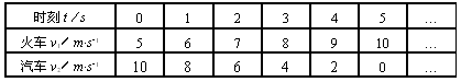 5、计算题 速度计显示的速度可以看作瞬时速度,下面给出沿直线做变速运动的火车和汽车,从开始计时及每隔1s记录的速度计的示数变化的情况。问:
