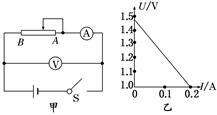 3、实验题 (10分)为了测量一节干电池的电动势和内阻,某实验小组按图甲所示的电路图连好实验电路,合上开关,电流表和电压表的读数正常,当将滑动变阻器的滑片由A端向B端逐渐滑动时,发现电流表的示数逐渐增大,而电压表的示数接近1.5 V且几乎不变,直到当滑片滑至临近B端时电压表的示数急剧变化,这种情况很难读出电压数值分布均匀的几组不同的电流值、电压值,出现上述情况的原因是________________.改进方法是_______________.改进后,测出几组电流、电压的数值,并画出如图乙所示的图象,由图象可知,这个电池的电动势为E=________V,内阻r=________ Ω.