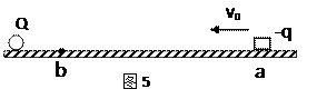 3、选择题  如图5所示,绝缘水平面上固定一正点电荷Q,另一电荷量为-q,质量为m的滑块(可看作点电荷),从a点以初速度v0沿水平面向Q运动,到b点速度为零,已知a、b间距为s,滑块与水平面间的动摩擦因素为u,重力加速度为g,以下说法正确的是: