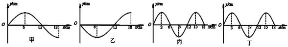 1、选择题 (6分) A、B两列简谐横波均沿x轴正向传播,某时刻的他们的波形分别如图甲、丙所示,经过时间t(t小于A波的周期TA),这两列简谐横波的波形分别变为图乙、丁所示,则A、B两列波的波速vA、vB之比可能的是(?)