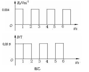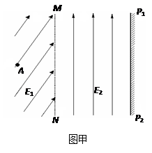 3、计算题 如图甲所示,在边界MN左侧存在斜方向的匀强电场E1,在MN的右侧有竖直向上、场强大小为E2=0.4N/C的匀强电场,还有垂直纸面向内的匀强磁场B(图甲中未画出)和水平向右的匀强电场E3(图甲中未画出),B和E3随时间变化的情况如图乙所示,P1P2为距MN边界2.28m的竖直墙壁,现有一带正电微粒质量为4×10-7kg,电量为1×10-5C,从左侧电场中距MN边界