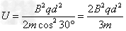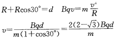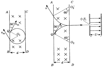 4、计算题 如图所示,在空间中存在垂直纸面向里的场强为B匀强磁场,其边界AB、CD的宽度为d,在左边界的Q点处有一质量为m,带电量为负q的粒子沿与左边界成30°的方向射入磁场,粒子重力不计。求: