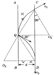 1、计算题 如图所示,在空间中存在垂直纸面向里的场强为B匀强磁场,其边界AB、CD的宽度为d,在左边界的Q点处有一质量为m,带电量为负q的粒子沿与左边界成30°的方向射入磁场,粒子重力不计。求: